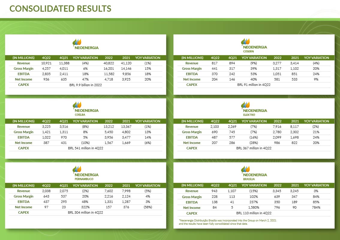 Net profit was BRL 714 million, up by 58% year on year. EBITDA was BRL 1 billion in 2022, up by 52% in the period. To anticipate demand foreseen with the free market, Neoenergia continues to consolidate its brand in the Brazilian energy sector and offer new services and products.