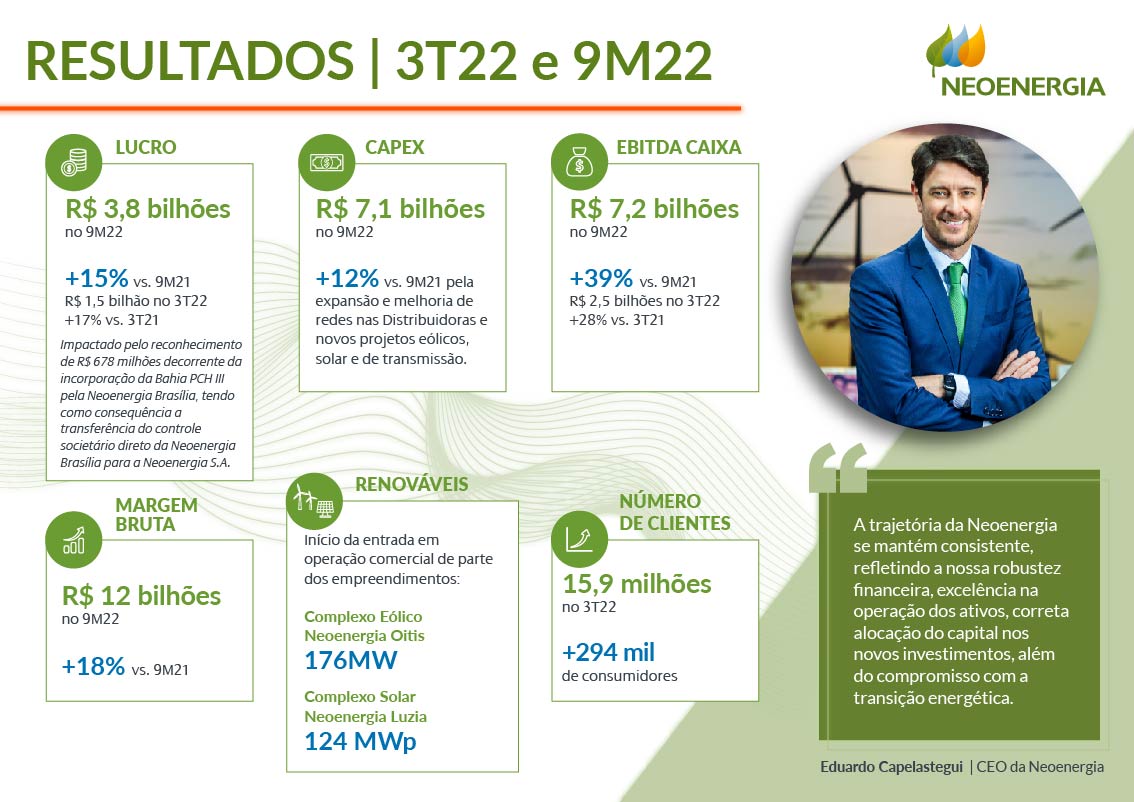 A companhia registrou lucro de R$ 1,5 bilhão no trimestre, e de R$ 3,8 bilhões de janeiro a setembro, com alta de 17% e de 15%, respectivamente, em relação aos mesmos períodos de 2021. Esse resultado foi impulsionado pelo avanço dos projetos em Renováveis, além da boa performance das distribuidoras. A companhia iniciou a operação comercial em Neoenergia Oitis, complexo eólico entre o Piauí e a Bahia; e em Neoenergia Luzia, primeiro complexo de parques solares da empresa, localizado na Paraíba. O desempenho se soma à maior geração de Neoenergia Chafariz, complexo de parques eólicos na Paraíba, que está em operação plena desde o ano passado.